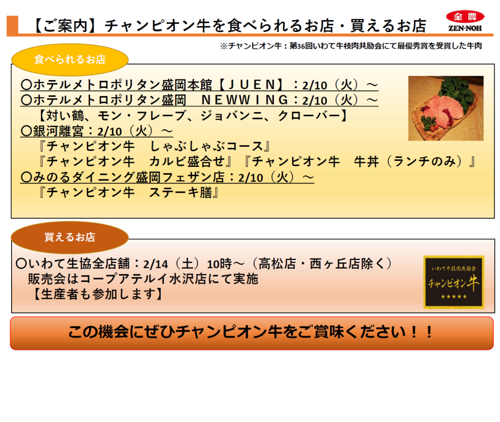 本日より第36回いわて牛枝肉共励会にて最優秀賞を受賞した『チャンピオン牛』のフェアが開催されます!